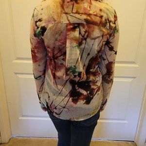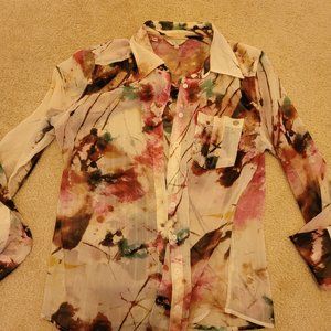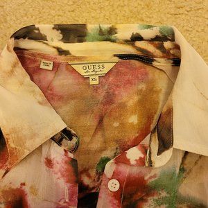 Slightly used Guess long sleave sheer patterned shirt. Pink, brown, teal and off white colors. Buttons in the front. Nice fall colors.