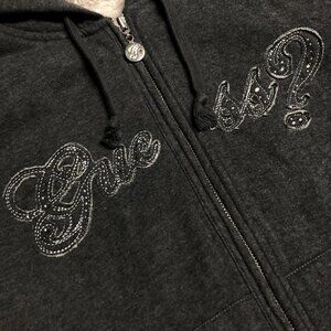 •late 2000s grey GUESS sherpa faux fur hoodie indie sleaze grunge rhinestone zip-up sweater 🎧❄️
