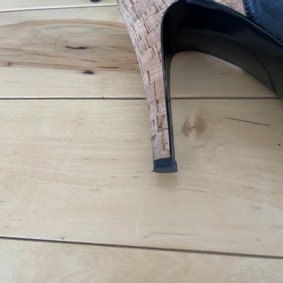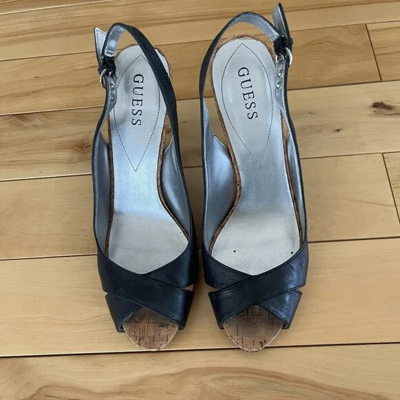 Guess brand black leather sling back, open toe shoe. Heal measures 4.5 inches from floor to top of back of heel. Heel lifts show no wear. Same shoe also available in a beige coloured leather.