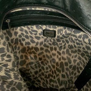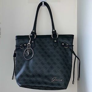 This Guess Shoulder Bag is in excellent used condition and includes a cute bag charm. There are minor signs of wear on the straps and discolouration inside the bag, but overall the bag functions well. No rips or tears and the zippers are in excellent condition.