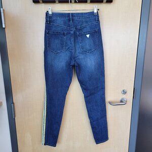 Skinny jeans to compliment the femal figure. Suitable for casual outings or running errands. Featuring a five pockets to hold small items, and flexible material for ease of movement. As well as a unique design on the side of the jeans with white and yellow stripping.
