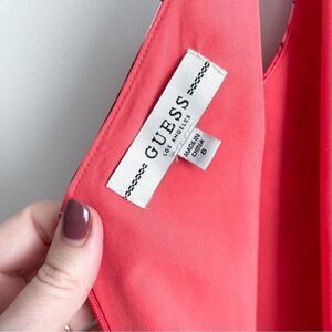 Guess Sleeveless Spaghetti Strap Coral Red Floral Jumpsuit Resort Beach Women's 8. V-Neck, side tie. Back zip, bodice is lined. Front slits approx. 26.5" long. The bottom photo shows the style of the garment, not the colour or pattern. Pretty tropical colours - perfect for a beach vacation! The fabric tag is missing, but I think the jumpsuit is Polyester. Very good used condition. Please see photos for approximate measurements.