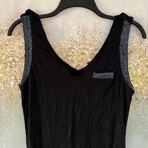 Size: Small. Color: Black. V-neck. Gray-blue chevron embroidery on sleeves and pocket protector. Drawstring gathering on both sides at waist.