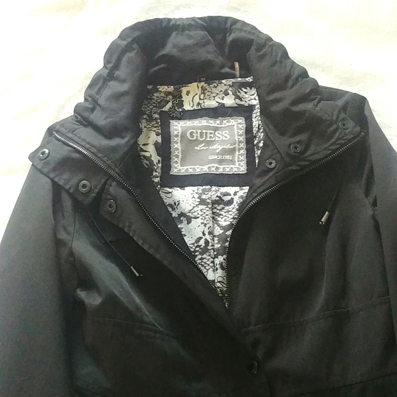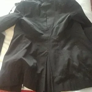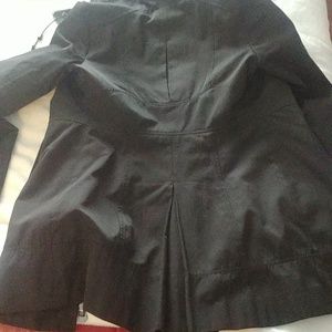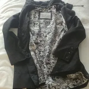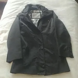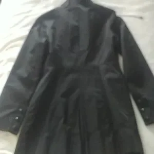 Black beautifully lined Raincoat. pleaded back for accent of slimming look. high collar with tie string