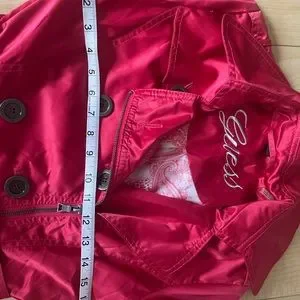 Double breasted detail with asymmetric zipper. Sash belt to tie. No known damages/staining. Lightly worn.