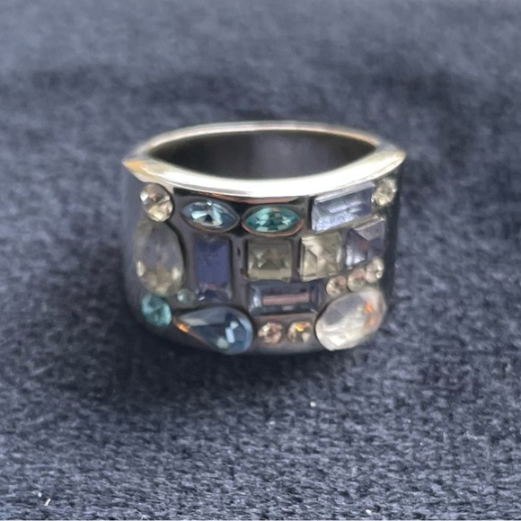 This stunning ring includes blue, purple and diamond-like crystals, set in a thick silver band. It’s very comfortable to wear and adds an elegant pop of colour to any outfit.