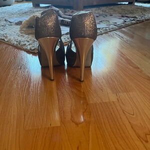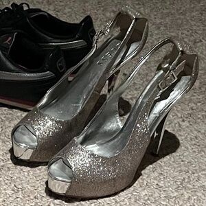 Metallic silver heel (around 3 inch heel) with pink sparkles covering the rest of the shoe.