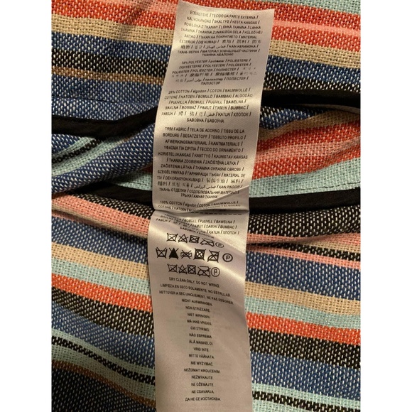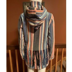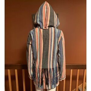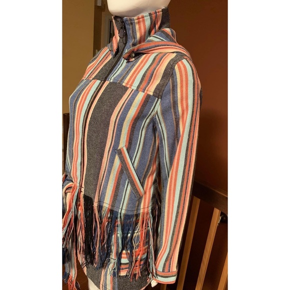 Standout stripes give this yarn-dyed jacket a vibrant finish, detailed with a fringed hem & removable hood. Two slip pockets, stand collar & front zipper closure.