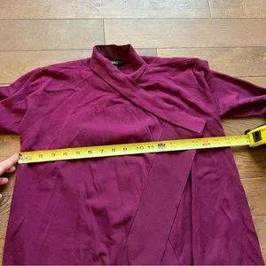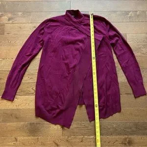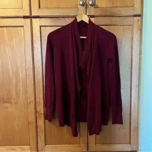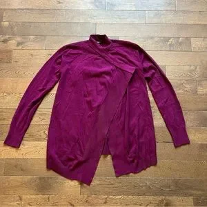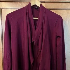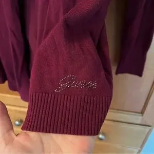 - Dark magenta coloured long sleeve cardigan sweater with the Guess logo in cursive on the side