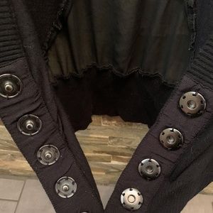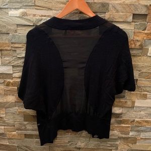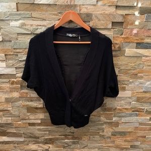 Cute cropped Guess sweater with 1/4 sleeves, large buttons to close in front, and sheer panel down the back.