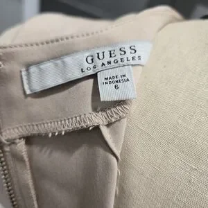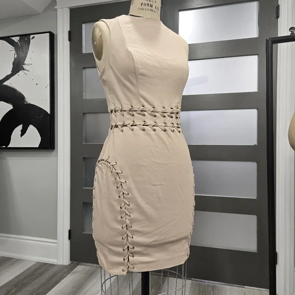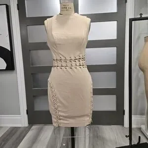 This Guess dress is a stunning tan mini with a ribbed texture and a bustier design, perfect for a cocktail night out. The sleeveless sheath style features a mock neck, offering a chic and modern silhouette. Its bodycon fit accentuates the figure, making it a standout piece for any evening occasion. color is more pink beige