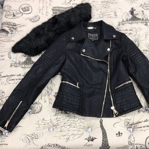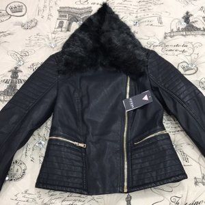 Show some attitude in this faux-leather moto jacket, featuring removable faux-fur trim along the collar, plus zippered cuffs and front zip pockets.