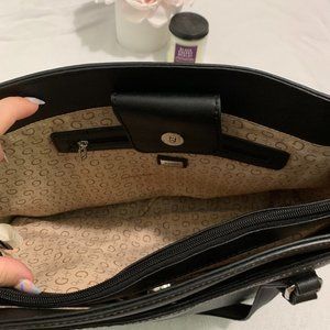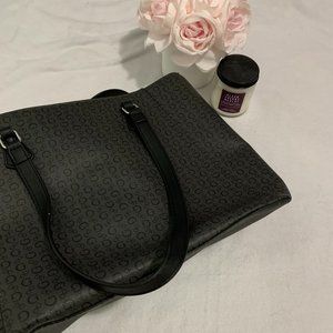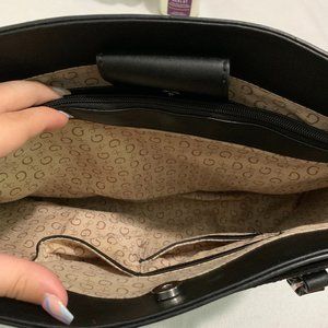 This is a black guess tote bag which is the perfect size! There is a pocket that perfectly fits a 13-inch laptop. Overall it is in good shape.