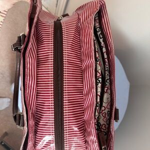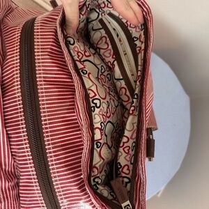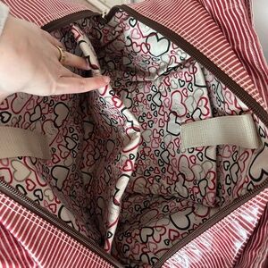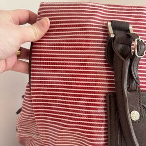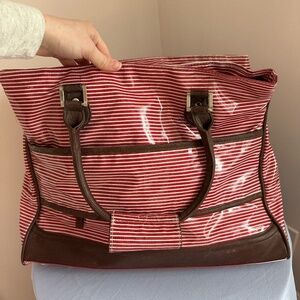 Guess tote bag featuring a red and white striped pattern with brown leather accents. The bag has two brown leather handles and a brown leather luggage tag attached to one of the handles. A silver Guess logo is centered on the front of the bag. This bag is a tote style, suitable for carrying everyday items. It features a red and white striped design while the brown leather accents add a touch of sophistication to the bag's overall look.