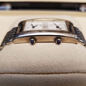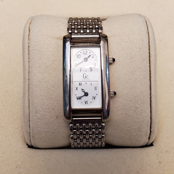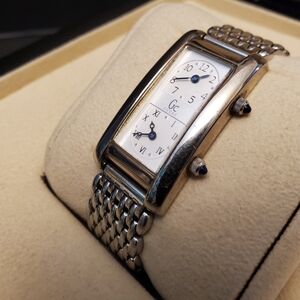 Hi Poshers, selling a unisex wristwatch from designer Guess. This is a beautiful stainless steel design two timer design, allowing the wearer to set two distinct times (currently set to EST and PST). New battery installed and is working perfectly. No issues setting time. No box or extra links, sorry.