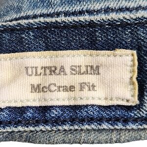 Guess, Ultra Slim, McCrae Fit, blue, midrise denim Jean pants. Zip-up fly with button closure, two front pockets with a watch pocket, two back pockets, belt loops and striped in the front. Super comfortable, lightweight and in great condition size 31x30