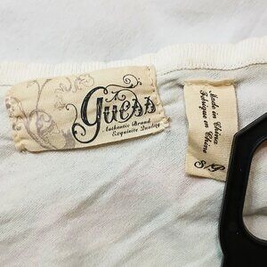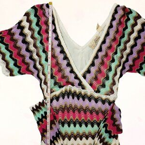Elevate your style with this stunning Guess Vintage Zig Zag Mini Dress in a size small. Made from a stretchy metallic gold knit fabric, this dress features a V-neckline, short sleeves, and a fabric belted waist for a flattering silhouette. Perfect for any occasion from weddings to casual outings, this dress adds a touch of retro charm with its crochet accents and bold multicolor zig zag pattern. Pair it with your favorite heels for a chic and fashionable look that is sure to turn heads.
