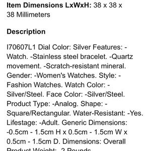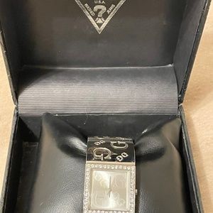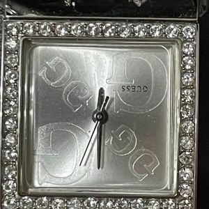 Swarovski crystal bezel, silver stainless steel, quartz movement, scratch & water resistant to 99 ft. Comes in Guess box on pillow, still has original plastic on watch. Don’t want to part with it, but I’m not that fancy lol.