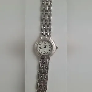 Stylish Guess watch with a silver-tone chain bracelet. Features a round face with bold numerals. Great condition. From very close up there is some minimal wear on the glass face of the watch. I tried to capture this in the last close up photo but not noticeable otherwise.