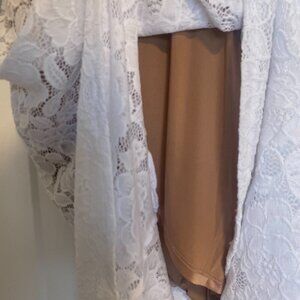 Elegant long sleeve lace dress. Features a V-neck and asymmetrical hem. Perfect for special occasions.