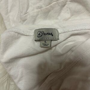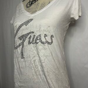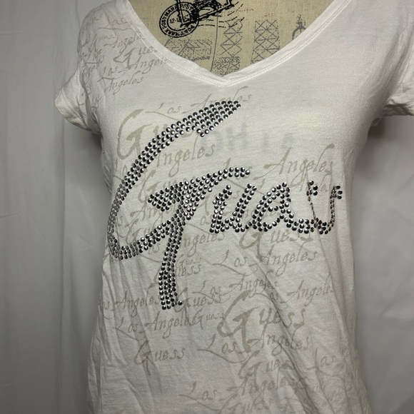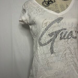 Chic Guess tee with rhinestone logo. Soft fabric. Casual elegance.