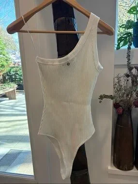 Ribbed knit one-shoulder bodysuit. Stretchy fabric for easy movement. Minimal, clean white finish. Versatile piece for layering or warm-weather wear.