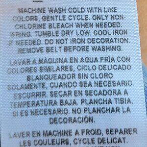 Machine wash cold with like colours, gentle cycle. Only non-chlorine bleach when needed. Can be wrung or tumble dry on low, or coolr ironed if needed. Don't iron decoration. Remove belt before washing.
