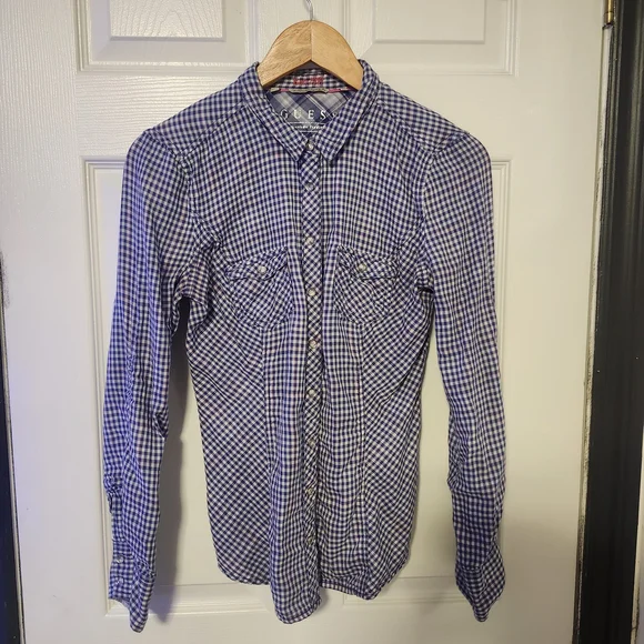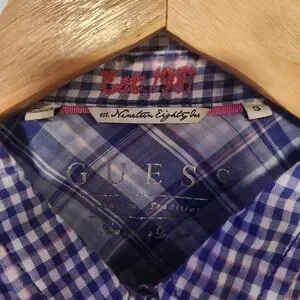 Stylish Guess shirt with a blue and white plaid design. Ideal for casual outings. Features button-down front and chest pockets.