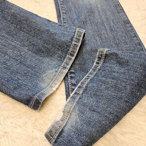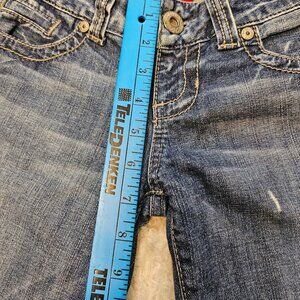 Check out this Guess Women's Blue Daredevil Boot Cut Stretch Distressed Embroidery Back Pockets Jeans in very great pre-owned condition. no stains on it.
