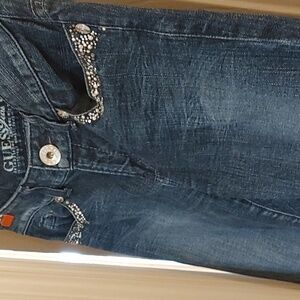 -3 front pockets with bling embellishments, 2 back pockets one plain one with bling with Guess Logo