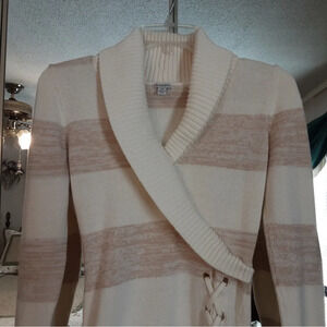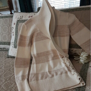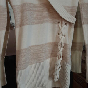 Guess Women's Fitted Beige + Cream Striped Crossover Collar Lace-Up Side XS sweater.