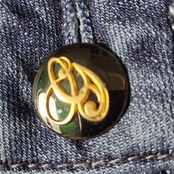 Embroidered roses on back pockets as well as black crystals. Black crystals under both front pockets