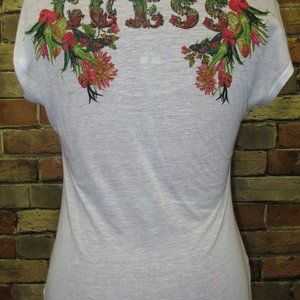front print scoop neck Guess t shirt, short sleeve, the back has print and Guess written across the shoulder
