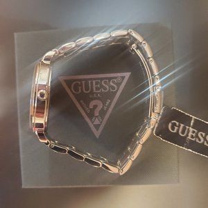 This Guess Women's W1231L1used watch features a white dial with crystals and silver hands. Fixed silver tone stainless steel bezel and a silver tone stainless steel case and a stainless steel bracelet. Quartz movement with analog display. Round case shape with a 38 mm case diameter. Scratch resistant mineral crystal. Functions: Hour, Minute, Second. Water resistance up to 30 meters. It has slight hairline scratches on the band.