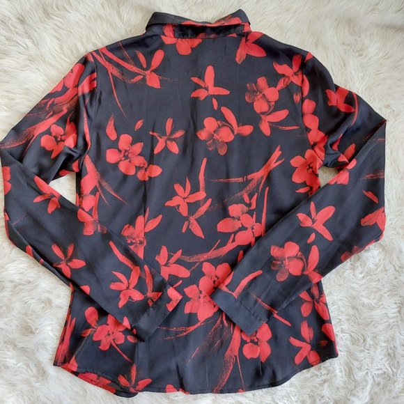 Guess Women's Red Floral Buttons Down Long Sleeve Sheer Shirt Siz S