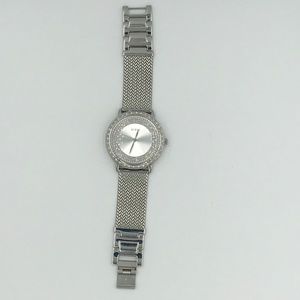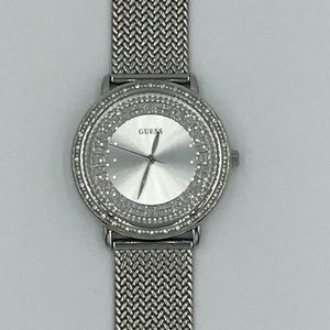 Guess Women’s Silver Tone Watch With Rhinestones Outlining The Inside & Outside Face Of The Watch. Watch Face Is Numberless With A Clean, Modern Look. Mesh Wristband With Locking Clasp Closure. Only Worn A Handful Of Times. The Watch Is Stunning. Needs a new battery.