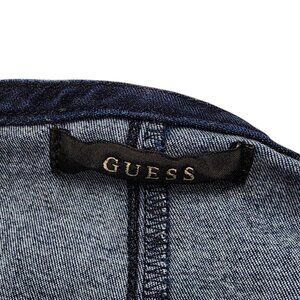 Guess Dark Wash High Waist Denim Bermuda Shorts in Size 30. These long jean shorts feature a sleek high-waisted design, side zip closure, and a structured fit for a flattering silhouette. Made from a cotton blend with slight stretch for comfort. A versatile piece that pairs well with sneakers, sandals, or heels for a trendy casual or dressed-up look.