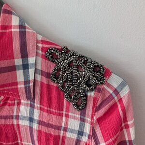 Guess Embellished Shoulder Plaid Shirt. Pink, navy blue, white plaid with two front pockets and embellished shoulders. Size XS. Snap closure, very lightweight.