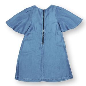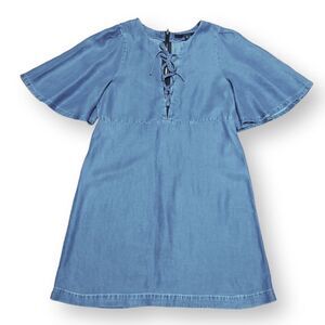 Guess Denim Tencel Lace Up Bust Tricia Flutter Dress In Denim. Short Bell Flutter Sleeves, Large Ornamental Zipper Back Closure. This Is A Soft Light Denim. Preloved But In Great Condition. I Wore On A Trip To Europe But Have Never Worn It Since. Super Cute And Comfortable.
