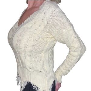 Guess ‘YVES CABLE DESTROY SWEATER’ SZ XS Distressed V-neck Fringe Knit Sweater