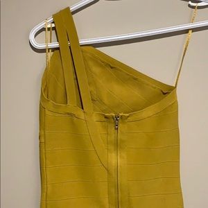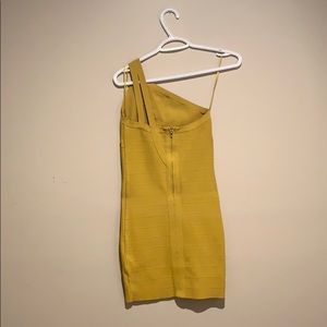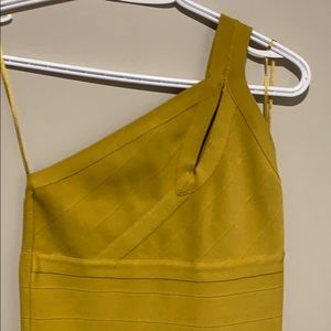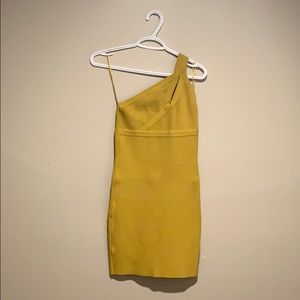 EUC Guess mustard yellow one-shoulder bodycon bandage dress with back zipper and eye-hook closure in women’s size small (S).