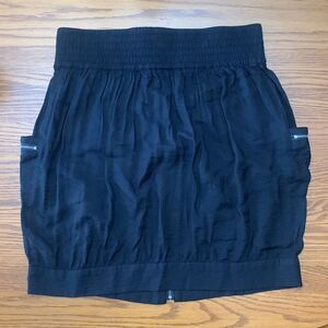 Full zip up black skirt from Guess in size Large. Great condition! Zippers on pockets are fully functional and double as extra pockets. Waist is elastic, and can be worn around the waist or at the hips.