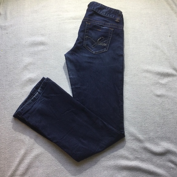 Guess blue bootcut jeans. Size 29 Silver “guess” details on right back pocket. Slight distressed details on tops of pockets.