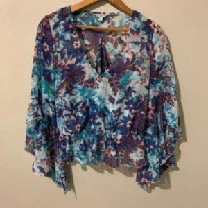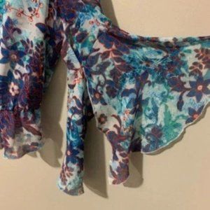 Guess blue floral print edgy and flowy top blouse XS size on tag. Would also fit small size hence listed as small size. Like new condition. No flaws. Flowy bell faltering sleeves. Pleated bottom. Bundle with other items to save on shipping plus 15% off three or more items.