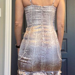 Guess by Marciano Bustier Body Con leopard print Dress. Size 4. Silky material (nylon, spandex and polyester). The fabric is stretchy, but it sucks you in at the same time. Size 4 I’m 5’5 110 pounds, D-cup. No bra needed!