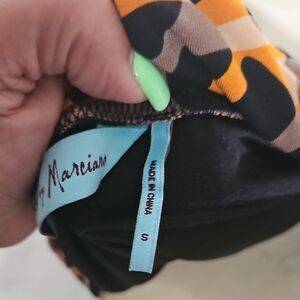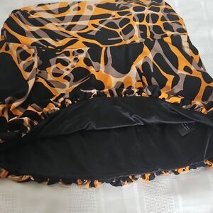 Bold Bubble Hem Mini skirt with striking abstract design. Features black, orange, and brown hues. Ideal for making a statement.