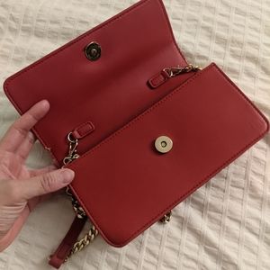 Red leather with gold coloured detailing, rectangular in shape. Good condition, worn a handful of times though where the chain meets the edges of the bag there is a bit of wear and tear.