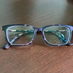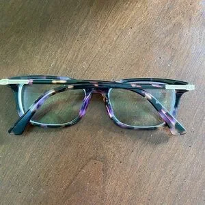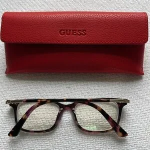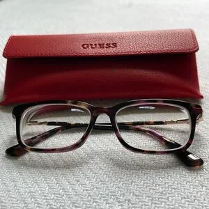 Beautiful Guess glasses frame. Tortoiseshell with a bit of purple, great colors. Includes Guess glasses case and cleaning cloth. Frame is suitable for a petite face. Measurements are 50 mm across the frame, 15 mm bridge and 140 mm temple(arm) length. My current Rx lenses can easily be removed!