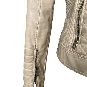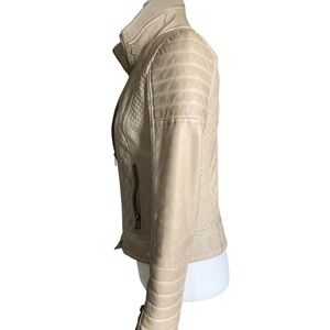 Guess, leather jacket, cropped jacket, tan jacket, distressed leather, women’s outerwear, zip-up jacket, faux leather, structured jacket, moto style, fall fashion, casual chic, designer jacket, preloved fashion, great condition.