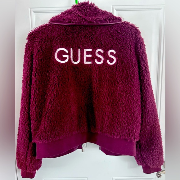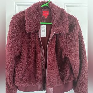 Guess fuzzy jacket, maroon color, size L, GUESS logo in white across the back, never worn, excellent condition